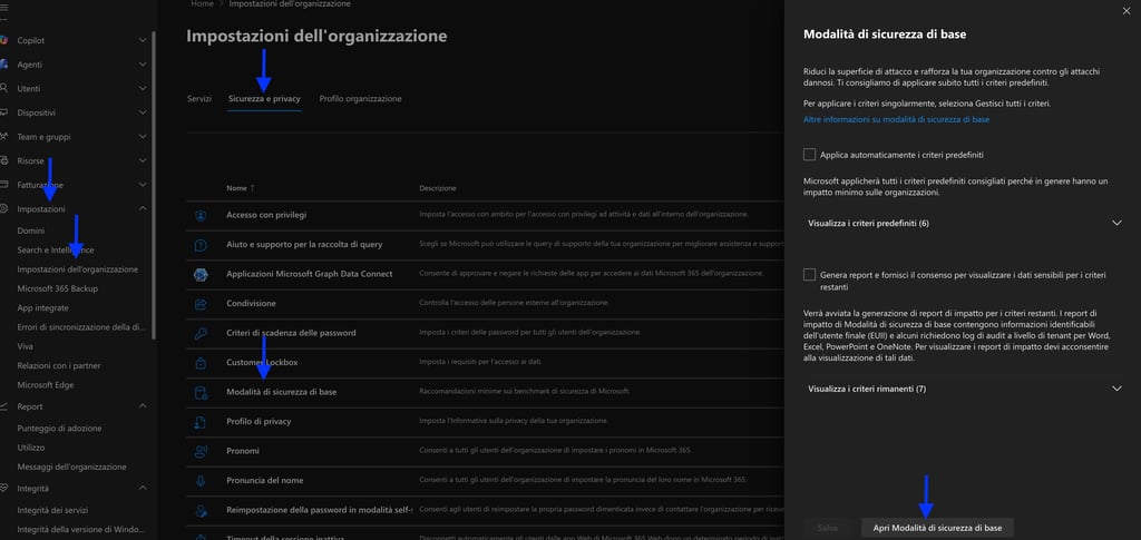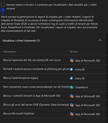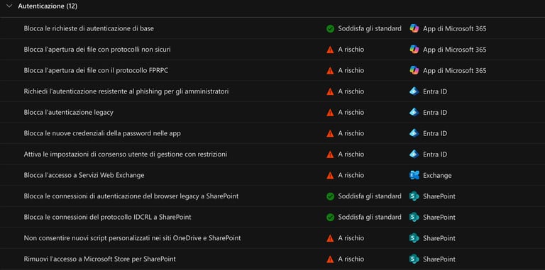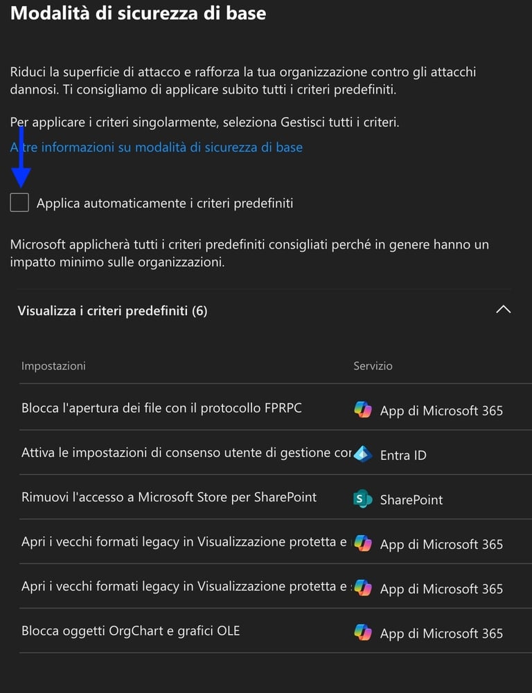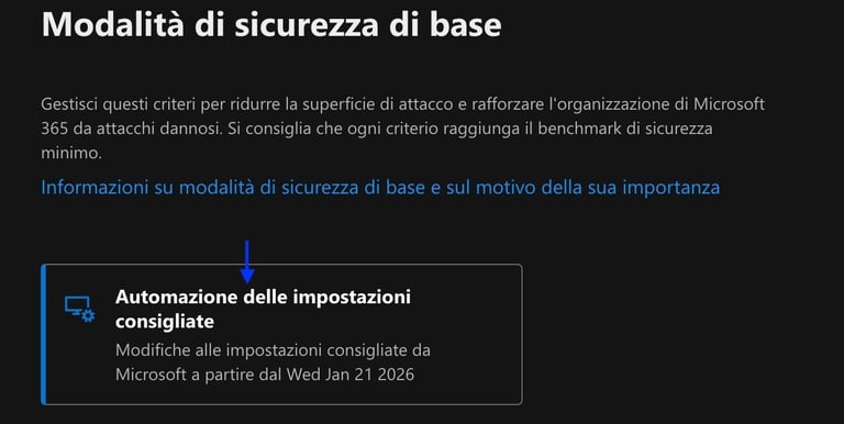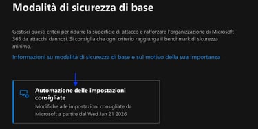 Queste impostazioni non sono “regole punitive”: sono configurazioni pensate per chiudere gap di sicurezza noti, bloccare protocolli obsoleti e standardizzare protezioni che spesso sono trascurate nei tenant esistenti.