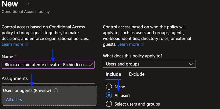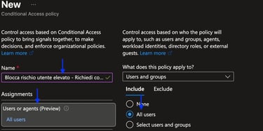 Diamo un nome alla nostra policy - Blocca rischio utente elevato - Richiedi correzione e sotto Users or agents selezioniamo All Users (se dovete escludere degli utenti\gruppi inseriteli nella sezione Exclude)
