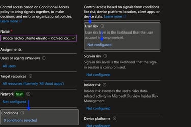 Non combinare user risk e sign-in risk nella stessa policy, poiché l’AND logico impedisce che si attivi se uno solo dei due segnali è vero.